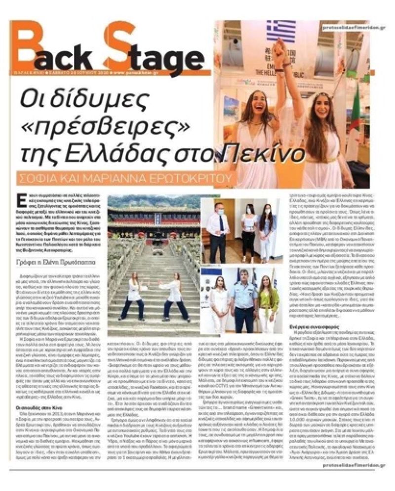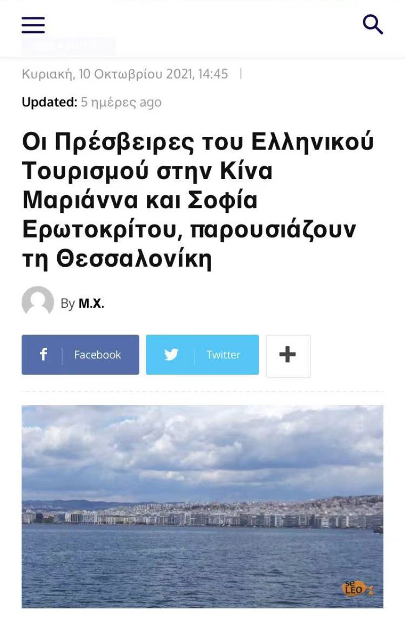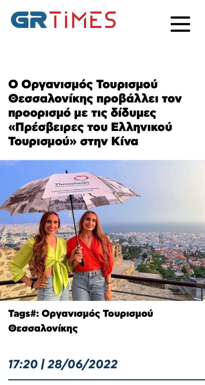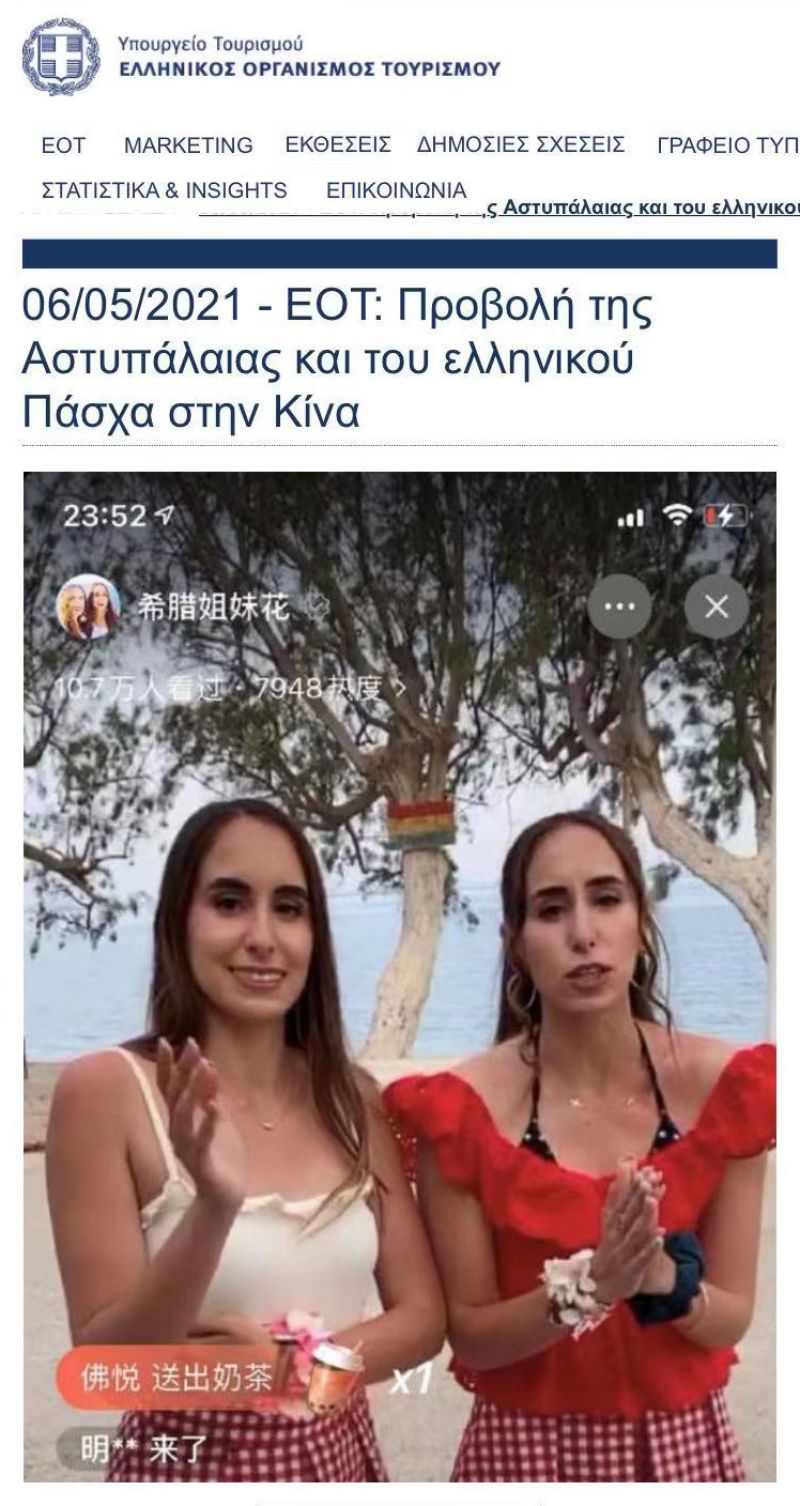 Τον τίτλο των «Πρεσβειρών Ελληνικού Τουρισμού» για την αγορά της Κίνας απένειμε ο Yπουργός Τουρισμού κ. Χάρης Θεοχάρης στις κ.κ. Μαριάννα και Σοφία Ερωτοκρίτου για το έργο που πραγματοποιούν στα ψηφιακά μέσα της Κίνας για την προώθηση της χώρας μας.