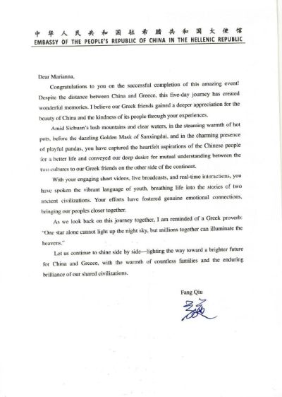Thank you letter from the Ambassador of the Peoples Republic of China in Athens.