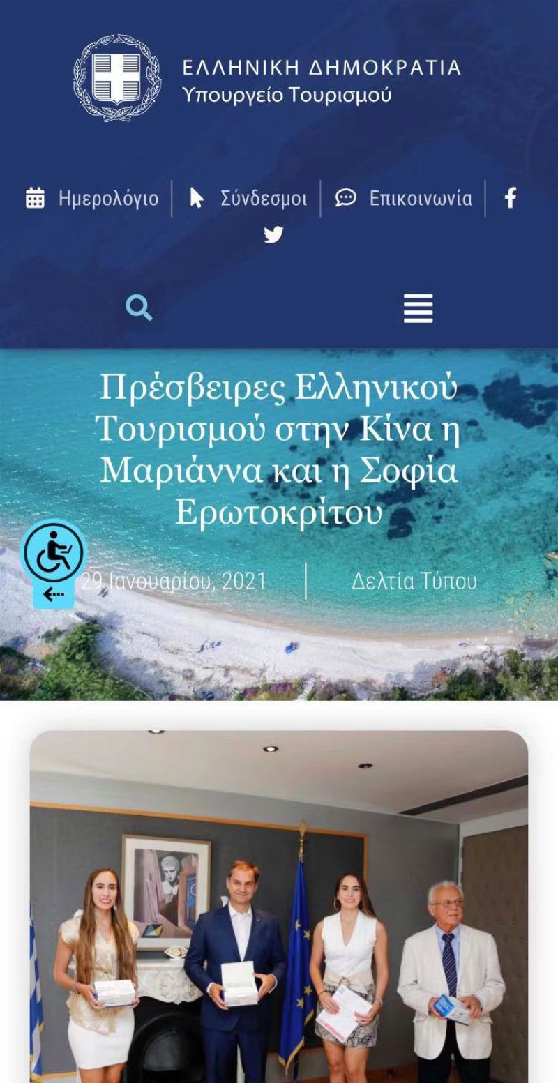Τον τίτλο των «Πρεσβειρών Ελληνικού Τουρισμού» για την αγορά της Κίνας απένειμε ο Yπουργός Τουρισμού κ. Χάρης Θεοχάρης στις κ.κ. Μαριάννα και Σοφία Ερωτοκρίτου για το έργο που πραγματοποιούν στα ψηφιακά μέσα της Κίνας για την προώθηση της χώρας μας.